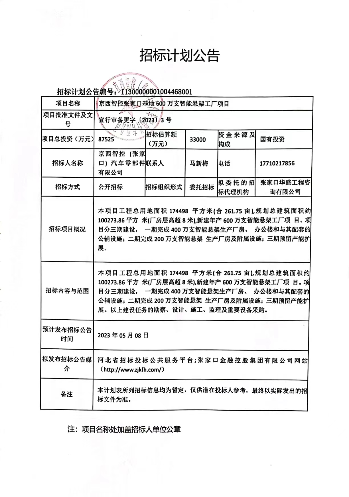 關(guān)于京西智控張家口基地600萬(wàn)支智能懸架工廠(chǎng)項目招標計劃公告