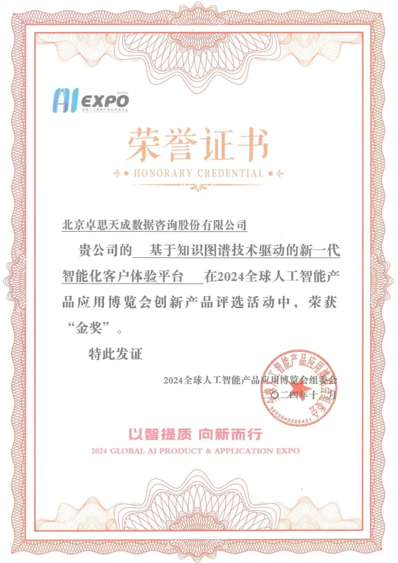 近日,“2024全球人工智能產(chǎn)品應用博覽會(huì )”(“全球智博會(huì )”)于蘇州舉行,會(huì )上重磅揭曉了十大產(chǎn)品金獎。張家口產(chǎn)業(yè)投資控股集團(簡(jiǎn)稱(chēng):張家口產(chǎn)投)被投企業(yè)——國內頭部CEM客戶(hù)體驗管理平臺北京卓思天成數據咨詢(xún)股份有限公司(簡(jiǎn)稱(chēng):卓思)“基于知識圖譜技術(shù)驅動(dòng)的新一代智能化客戶(hù)體驗平臺”憑借技術(shù)先進(jìn)性、創(chuàng )新性和應用性成功入選,一同上榜的還有華為、煤炭科學(xué)研究總院等企業(yè)及國家級科研機構。