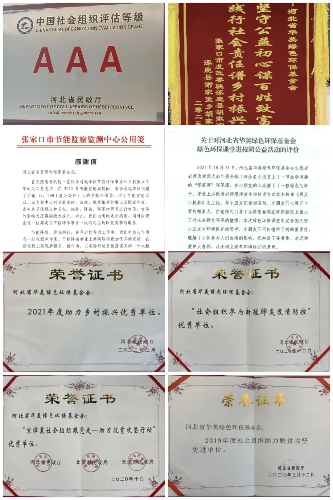 2019年被河北省民政廳授予“社會(huì )組織扶貧攻堅行動(dòng)”先進(jìn)單位稱(chēng)號;2020年獲得河北省民政廳、北京市民政局、天津市民政局聯(lián)合頒發(fā)的“京津冀社會(huì )組織跟黨走—助力脫貧攻堅行動(dòng)”優(yōu)秀單位證書(shū),同時(shí),獲得省民政廳授予的“社會(huì )組織參與新冠肺炎疫情防控”優(yōu)秀單位稱(chēng)號;2021年獲得省民政廳授予的“助力鄉村振興”優(yōu)秀單位稱(chēng)號;2020年3月收到湖北省黃岡市感謝信;收到公羊會(huì )公益基金會(huì )感謝視頻;收到共同行動(dòng)助學(xué)基金會(huì )感謝信;2021年收到中華救助基金會(huì )捐贈感謝證書(shū);2022年收到張家口市陽(yáng)原縣西城鎮黃糧坡中心學(xué)校、張家口市涿鹿縣謝家堡鄉胡家溝村村委會(huì )及張家口市發(fā)展和改革委員會(huì )的評價(jià)信、感謝信及榮譽(yù)錦旗。2023年收到張家口市節能監察監測中心、北京市東城區西河沿社區、張家口橋西區長(cháng)青路小學(xué)、永豐堡小學(xué)、第二幼兒園等單位的感謝信、評價(jià)信及錦旗。